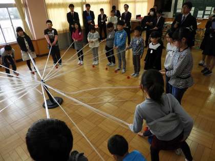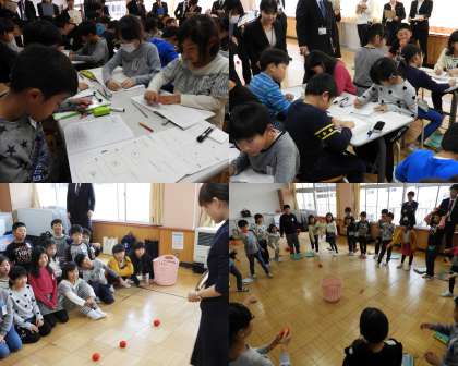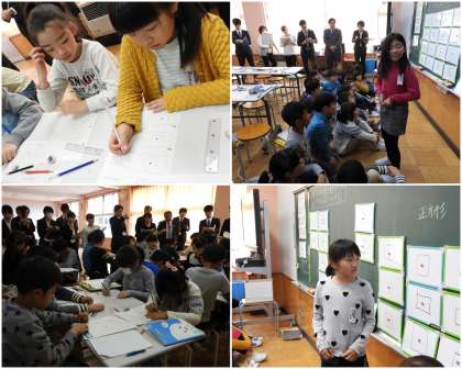 子どもたちは、ワークシートに様々な方法を考え出しました。正方形や正三角形の角を丸くしたり、かぎかっこのように並ぶようにしたりなど、想定していなかった考えも出され、やっぱり子どもはすごいなあと感心されました。