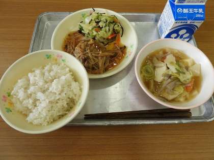 写真のように、子どもたちには、麦ごはん、牛乳、ハンバーグ和風きのこソース、白菜と塩昆布の和え物、けんちん汁が配食されています。和風きのこソースは、レストランで食べているような本格的な味付けでした。
