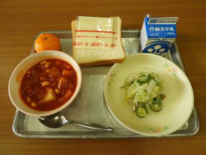 食パン、牛乳、スライスチーズ、豚肉と大豆のケチャップ煮、ハム入りサラダ、みかんです。今日は、献立表にありますようにぶどう(巨峰)を予定していましたが、より新鮮なみかんを子どもたちに配食しました。