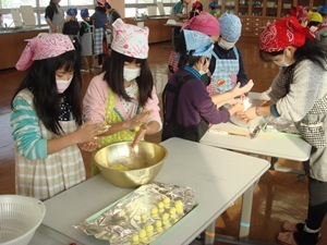 各学級ごとに家庭科室でだんご作りを教えていただきました。