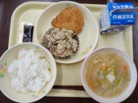 今日の給食は、ご飯、牛乳、シューマイ、ゴーヤの炒め物、生揚げとわかめの味噌汁でした。