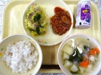 五目うどん、さつまいもの天ぷら、おかか入りおひたし、牛乳でした。