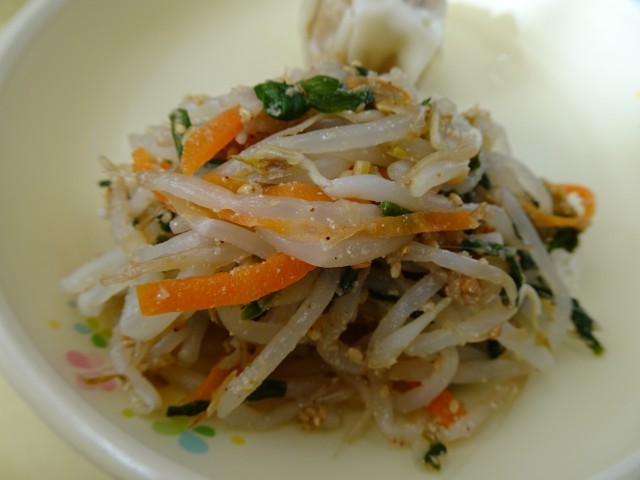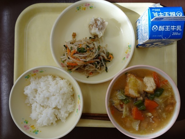 ごはん、豚肉シューマイ、生揚げの中華煮込み、ニラともやしの香味和え、牛乳でした。