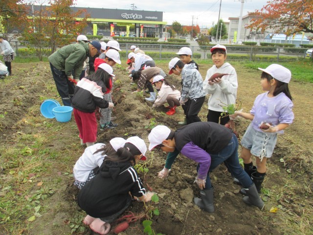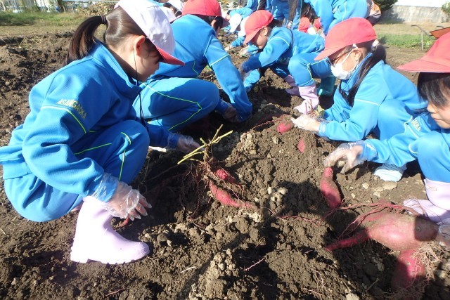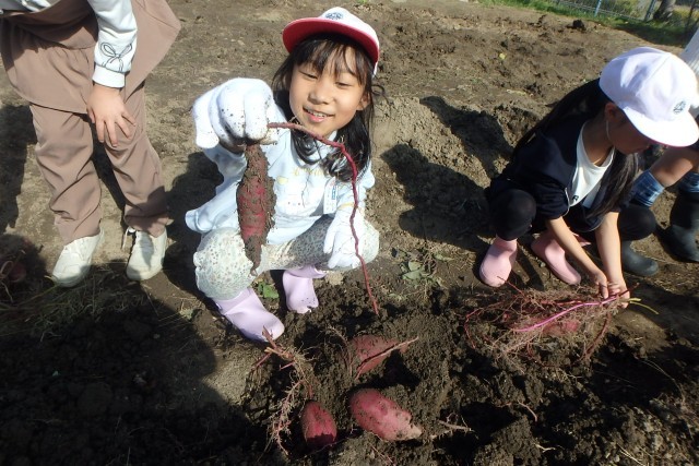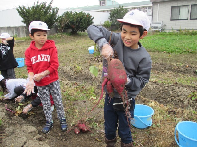 短い秋…、たくさんの行事の合間をぬったり、天候を考慮したりして、ようやくさつまいも掘りができました。前日の持久走記録会の疲れも吹っ飛ぶほどの「大収穫に大興奮」の子ども達でした。畑を耕したり、暑い夏にも草取りをしてくださったりした方々のおかげです。子ども達もしっかり根付くようにと日よけの草布団や、水やりに励みました。