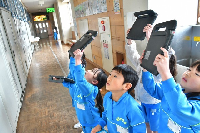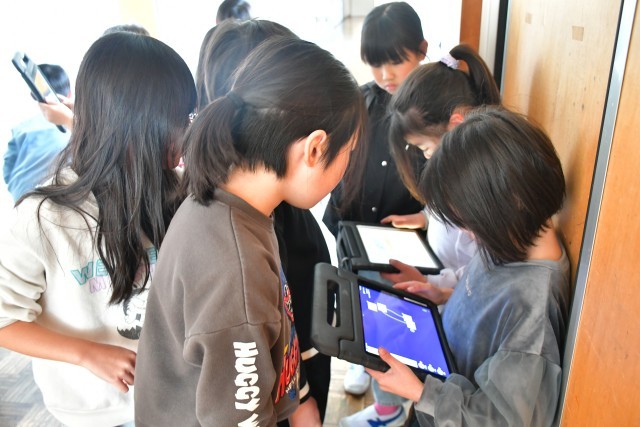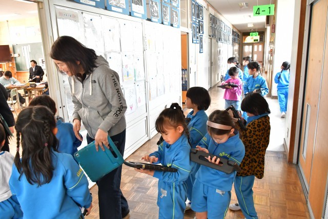 他の学年の子ども達が頑張って描いた作品をお互いに見合い、素敵な出会いを楽しんでいます。タブレットで写真を撮る子どもも、自分の作品を撮ってもらう子ども、目がキラキラと輝いていました。