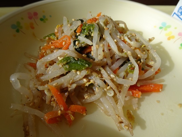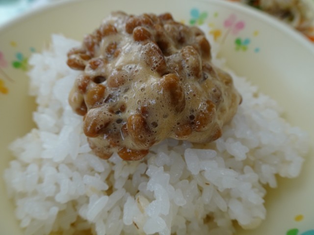 麦ごはん、納豆、ほうれん草ともやしのごま和え、キャベツとじゃがいものみそ汁、牛乳でした。