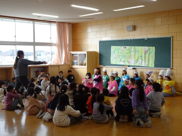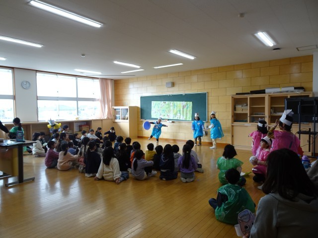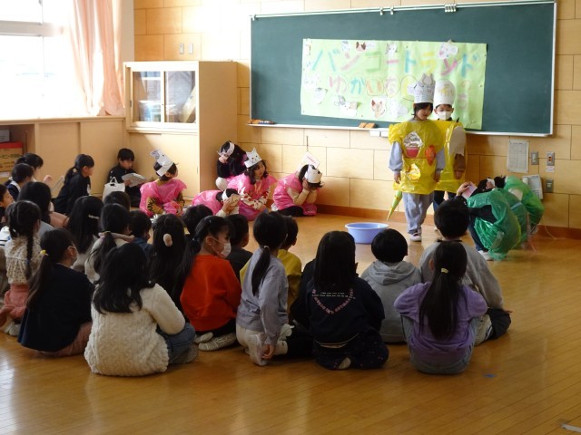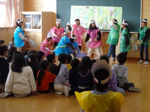 2年3組のみなさんは、1年3組を招待して、劇の発表をしていました。