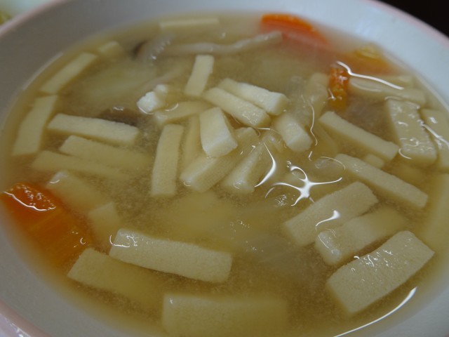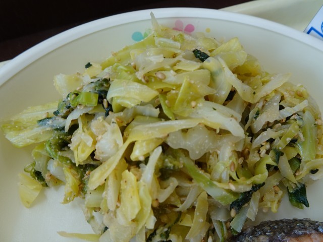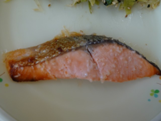 ごはん、鮭の塩こうじ焼き、野菜のごま和え、シメジとしみ豆腐のみそ汁、ふりかけ、牛乳でした。