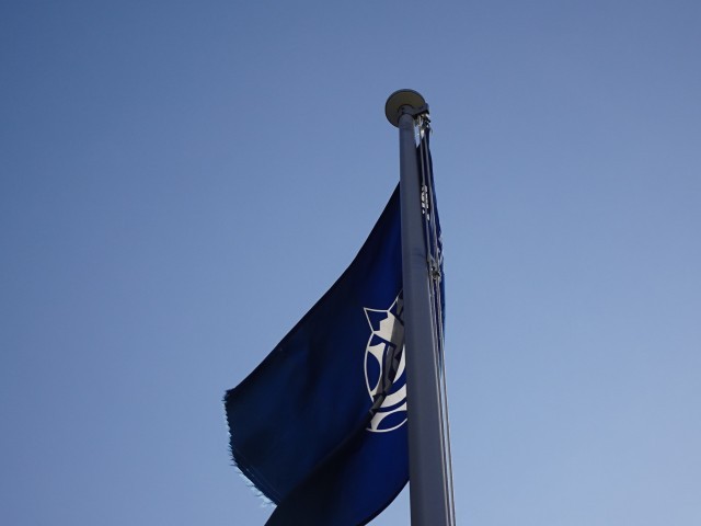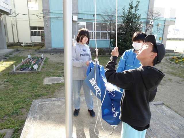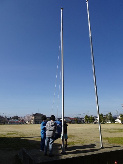 今年度の運営委員が、転記のよい空に校旗を掲揚しました。