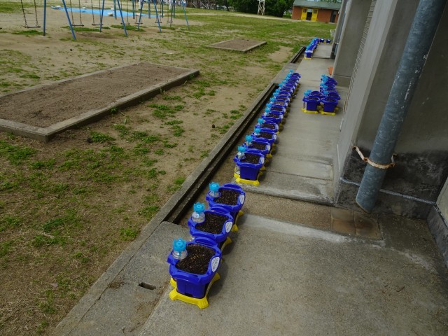 1年生教室前のアサガオの植木鉢!早く芽が出るといいですね!