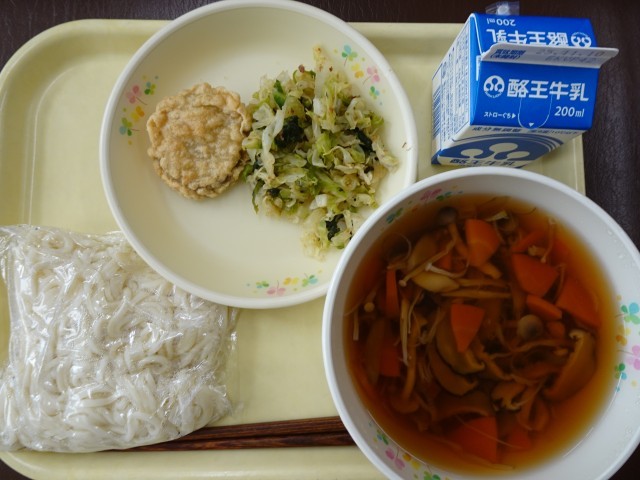 本日の給食を紹介します。五目うどん、さつまいもの天ぷら、おかか入りおひたし、牛乳でした。五目うどんにキノコもたくさん入っていて、キノコの出汁が出ていて最高でした。