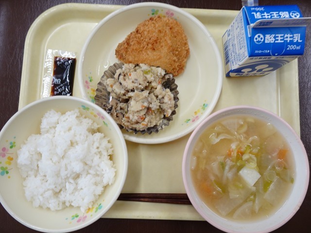 本日は、いわきグルメメニューです!ツナごはん、キャベツと小松菜のサラダ、八杯汁(いわき市の郷土料理)、牛乳でした。ツナごはんもいわきの給食では、大人気メニューとなっています。本日も、大変おいしくいただ...