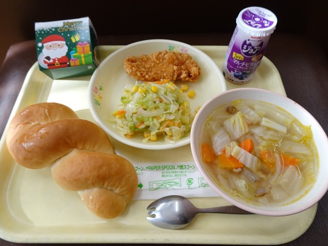 本日の給食は、クリスマスメニューです。ツイストパン、飲むヨーグルト、鶏唐揚げ、イタリアンサラダ、野菜スープ、そして、みんなお楽しみの☆けーき☆です!!ロールケーキ、チョコレートケーキ、ストロベリーケー...