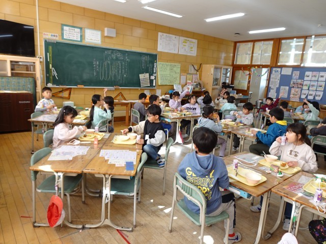 給食中、2年1組を訪問しました!みんな嬉しそうに給食を食べています。最初にケーキにたどり着いたのは!!!お次は!!!続いて、運命のじゃんけんが!!!!