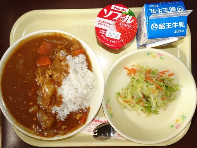 本日の給食を紹介します。チキンカレーライス、キャベツサラダ、牛乳、ヨーグルトでした。おいしいカレーライスをたくさん食べて、元気に活動できたのではないでしょうか。