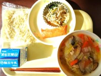 今日の給食を紹介します。チャンポンめん、春巻、もやしのナムル、牛乳でした。春巻は揚げたてのパリパリ感がずっと持続して、とってもおいしかったです。