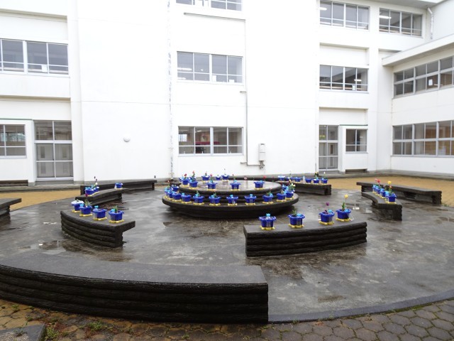 校庭の中を春を探して歩いていました。写真は、花壇で咲いているパンジーやチューリップを見ながらスケッチしています。みんな真剣に花を見てかいていました。