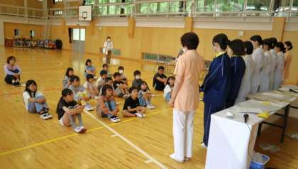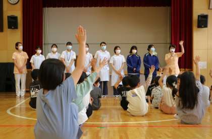 今日は、東北歯科専門学校から2名の先生、8名の学生さんが訪れ、子どもたちに正しい歯磨きの仕方や歯やはぐきの病気などについて教えてくださいました。