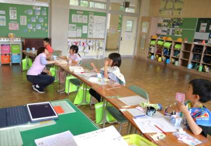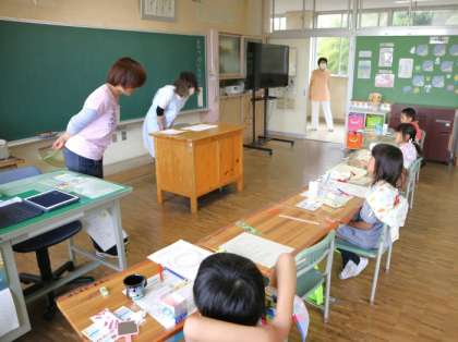 1年生は初めての歯磨き教室です。少しどきどきしているようでしたが、教室に戻ってからは薬剤で歯の汚れを確かめ、正しい歯磨きの仕方を教えてもらい、丁寧に磨けるようになりました。