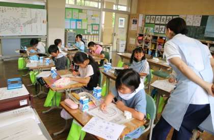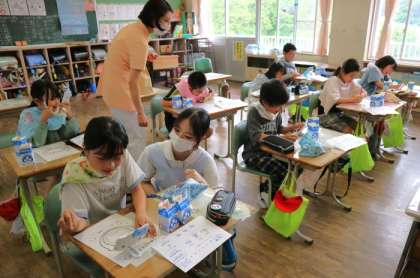教室に戻った4年生も、薬剤を使った歯の汚れの染め出しを行いました。家から持ってきた手鏡で磨き残しをチェックし、カードに記録していきました。