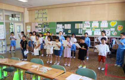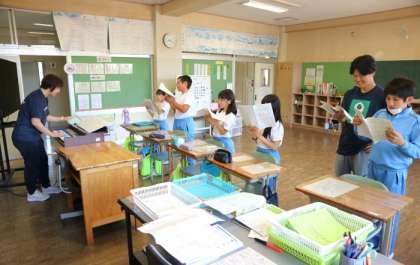 1年生から4年生、5・6年生の2部合唱で歌います。朝の時間を使いながら、少しずつ練習を重ねています。