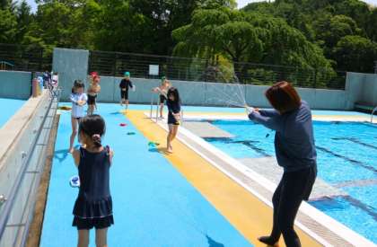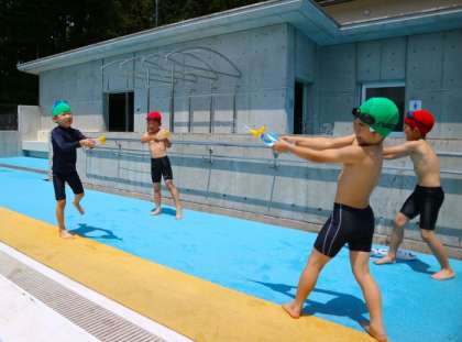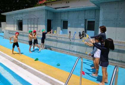 1年生は初めて小学校のプールに入るので、最初、水に慣れるためにペットボトルの水鉄砲で水かけゲームをしました。