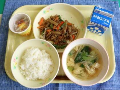 今日の給食の食材で福島県産のものは、あさか舞、納豆、豚肉、豆腐、牛乳、小松菜、もやしです。