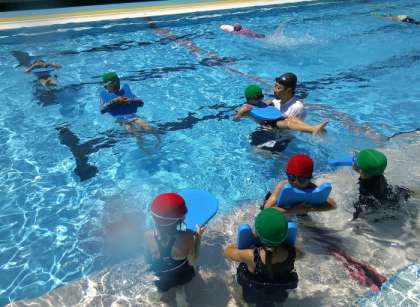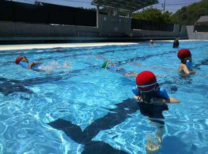 水中棒拾いは、1年生はどの棒を拾ってもOKですが、2年生は違う色の棒を拾うように難易度を変えています。後半はビート板を使い、いろいろな浮き方に挑戦しました。