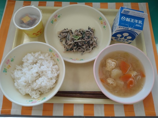 今日の献立は「麦ごはん、牛乳、納豆、ひじきのサラダ、にんじんとじゃがいものみそ汁」です。ひじきは、長さ1メートル以上になる大型の海藻です。生では、アクが強く食べられないので、加熱して加工します。また、ひじきは加工される部位によって呼び名が異なり、葉の部分は「芽ひじき」、枝の部分は「長ひじき」と呼び、区別しています。