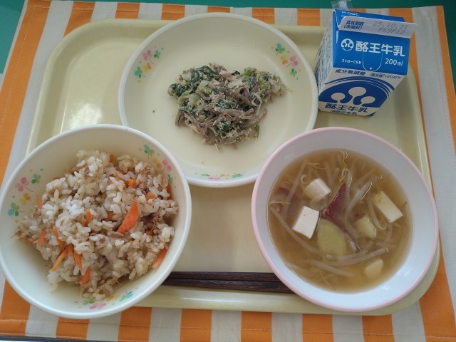 今日の献立は「にんじんしりしりごはん、牛乳、こんにゃくのごまサラダ、さつまいも汁」です。10月10日は目の愛護デーですね。目の健康に役立つ食品を紹介します。今日は「にんじん、ほうれん草」です。にんじんやほうれん草には、βカロテンという栄養素がたくさんあります。β カロテンは、体の中でビタミンAに変身して、目の粘膜や網膜を健康に保つ働きをします。にんじんやほうれん草をすすんで食べましょう。