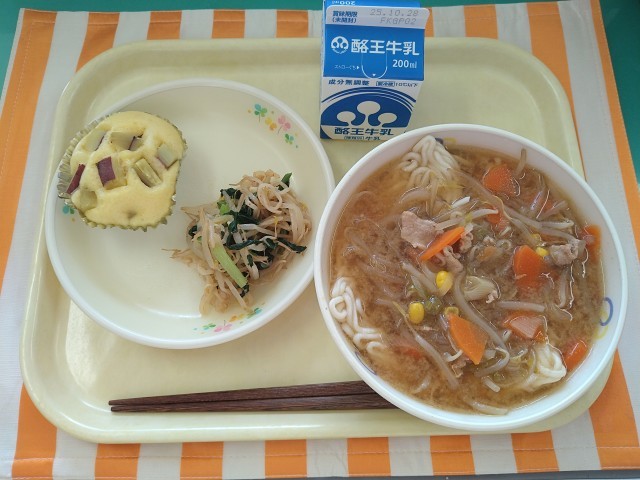 今日の献立は「みそバターうどん、牛乳、もやしの七味和え、さつまいも蒸しパン」です。さつまいもには、おなかの調子をよくする「食物繊維」がたくさん含まれています。さつまいもの皮や皮に近い実の部分に特に多く含まれているので、皮ごと食べるとさつまいもの食物繊維をしっかりとることができます。
