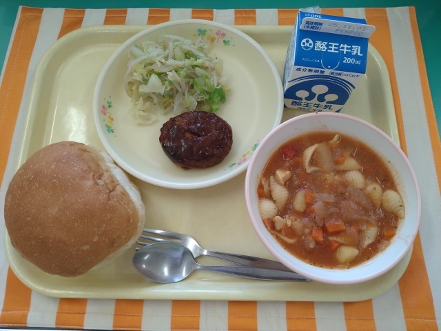 今日の献立は「バンズパン、牛乳、ハンバーグ、ボイル野菜、ミネストローネ」です。ミネストローネにセロリを入れて作りました。セロリは、独特の強い香りが特徴の野菜です。サラダ料理にして、生で食べることができますが、煮込み料理やスープ、炒め物などに、少しだけ加えると、味のアクセントになります。洋風な料理に活用してみましょう。