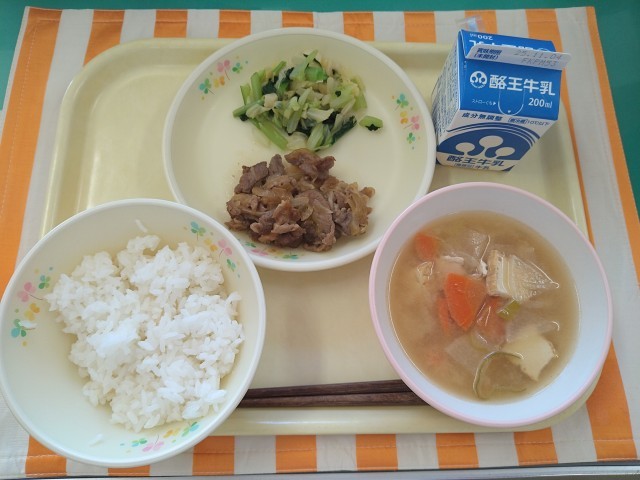 今日の献立は「ごはん、牛乳、豚肉と玉ねぎの炒め物、キャベツの浅漬け、南蛮汁」です。南蛮は、室町時代以降に日本に来航した、ポルトガルやスペインなどの外国人やその文化を表す言葉として使われています。「ネギ」や「唐辛子」といった、当時、日本にはなかった食材を使った料理に「南蛮」の名前が付けられています。