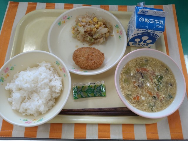今日の献立は「ごはん、牛乳、マグロカツ(パックソース)、コーン入りおかか和え、かきたま汁」です。まぐろは、エラ呼吸をしていますが、エラを動かす筋肉がないので、泳ぐことで、口に入れた海水から、酸素を体に取り入れています。そのため、泳ぎを止めると死んでしまいます。まぐろは、眠ることなく、泳ぎ続けている魚です。