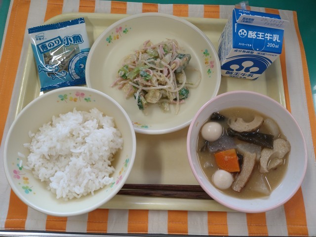 今日の献立は「ごはん、牛乳、みそおでん、マロニーサラダ、青のり小魚」です。室町時代には、「おでん」は田楽のことでした。田楽には、種を串にさして焼いた「焼き田楽」と、種をゆでた「煮込み田楽」がありました。江戸時代になって、焼き田楽を「田楽」と言い、煮込み田楽を「おでん」と言って、区別するようになりました。