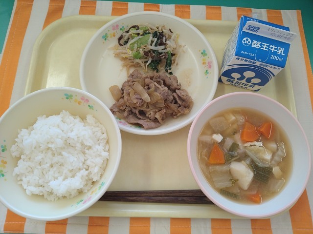 今日の献立は「ごはん、牛乳、豚肉の生姜炒め、もやしときくらげの和え物、里芋のみそ汁」です。福島県では、「GAP認証農産物」をすすめています。働く人や自然環境、農産物に対して、約130ある「やり方」や「ルール」を守って生産された農産物にGAP認証マークが付けられています。今日の和え物の中の「もやし」はGAP認証農産物です。もやしの他にも、GAP認証マークがついた農産物があるかお店で探してみましょう。