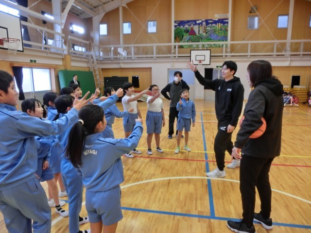 本日、福島ファイヤーボンズの小川 翔矢選手が来校し、バスケット教室とキャリア教育を行ってくれました。