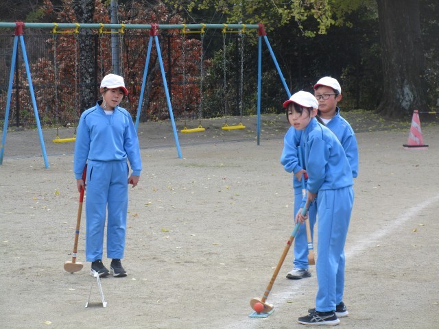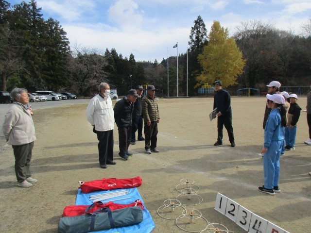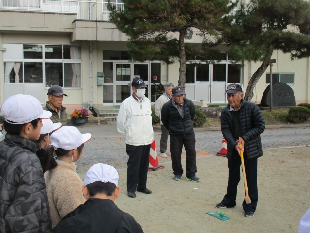 秋晴れの下、子どもたちは老人会の方々に優しく教わりながら、楽しそうにグラウンドゴルフを体験し、世代を超えた温かい交流を深めることができました。