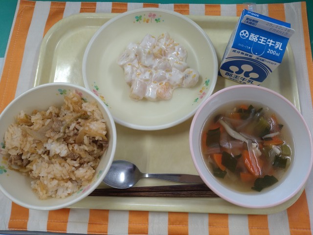 今日の献立は「キムたくごはん、牛乳、フルーツヨーグルト和え、野菜スープ」です。今日は「宮城小3・4年生のリクエスト献立」です。キムたくごはんを食べて、口の中が辛くなったなぁ~と思ったら、あまずっぱいフルーツヨーグルトを食べてみましょう。果物の甘さと乳製品によって、辛さが和らぎます。口の中がもとにもどって、また、もりもり食べられます。