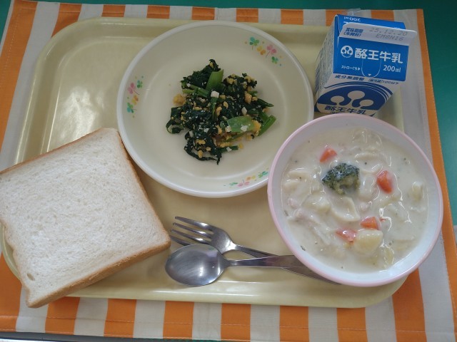 今日の献立は「食パン、牛乳、白菜のクリーム煮、青菜の玉子チーズ和え」です。白菜に黒い点々があるときがあります。何だろう?と、気になるかもしれませんが、病気でも虫でもありません。この黒い点は、人間に例えるとホクロのようなもので、ポリフェノールという色素の集まりです。食べても問題はないので、安心して食べられます。