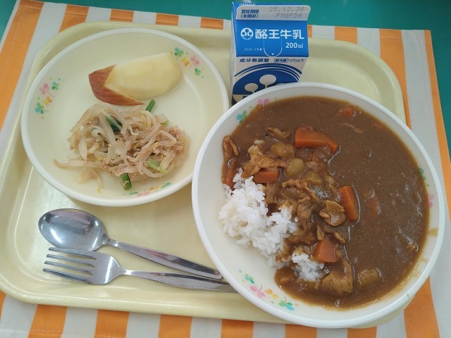 今日の献立は「ポークカレーライス、牛乳、もやしと大根のサラダ、りんご」です。今日は「SDGs献立」です。給食を通して、食品ロスや生ごみの削減などについて考え、「持続可能な社会の実現」に貢献したいと思います。カレーのにんじんには皮がついています。にんじんの皮を捨てずに食べることで生ごみの削減を目指しています。家庭でも、取り組んでみましょう。