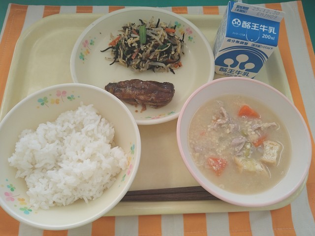 今日の献立は「ごはん、牛乳、いわしのごまみそ煮、ひじきの五色和え、呉汁」です。今日は「食育の日献立」です。和食は、野菜をたくさん食べることができて、たんぱく質、脂質、炭水化物といった栄養素のバランスも優れています。豆、ごま、海藻、野菜、魚、きのこ、いもなどの食品をすすんで取り入れ、家庭でも和食をどんどん食べるようにしましょう。
