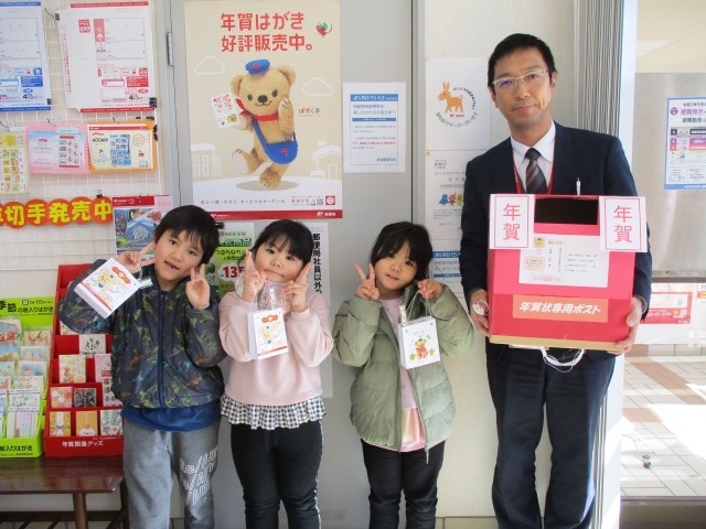 郵便局では、局員の方から年賀状がどのように届くのか、詳しくお話をしていただきました。子どもたちは興味津々で耳を傾け、自分たちのハガキが届く仕組みを学ぶことができました。
