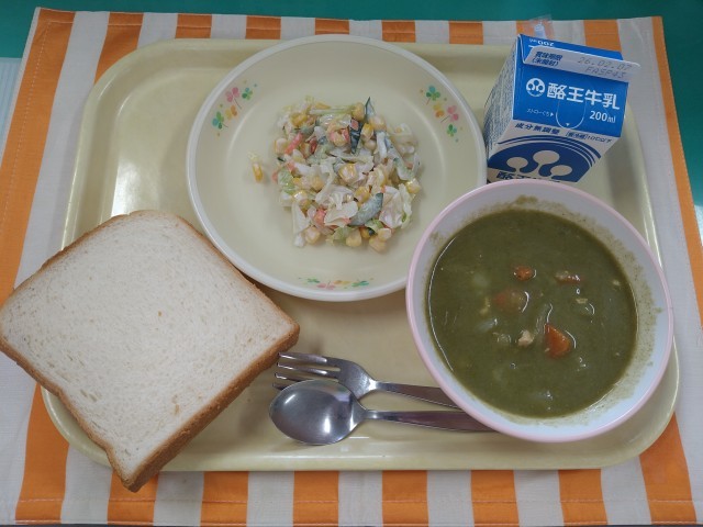 今日の献立は「食パン、牛乳、グリーンカレー、コールスローサラダ」です。郡山市では、福島県で結成されたボーカルグループ「GREEEEN(当時)」にちなんで、緑色いっぱいのほうれん草のペーストを使った『グリーンカレー』を広めています。見た目には驚きますが、食べてみるとおいしいです。スパイシーでいつもとちょっと違ったカレーをどうぞめしあがれ!