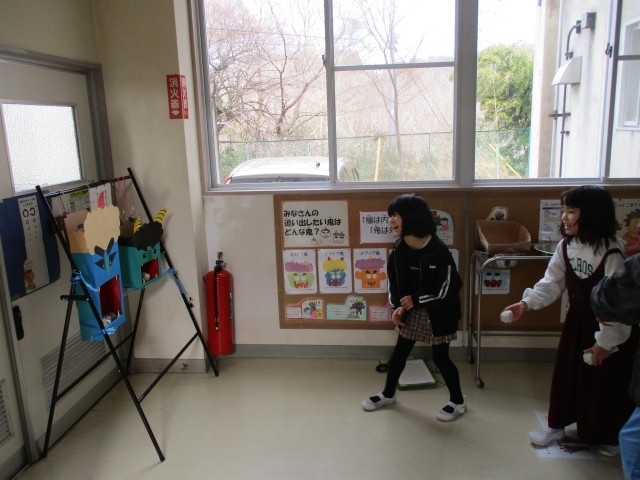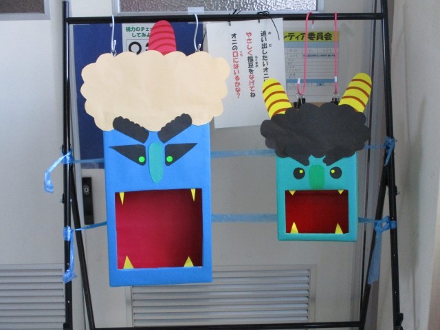 保健室前で「心の鬼」を退治!明日は節分です
