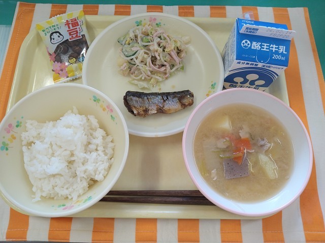 今日の献立は「ごはん、牛乳、いわしの生姜煮、マロニーサラダ、豚汁、節分福豆」です。今日は「節分献立」です。季節の変わり目には体調を崩しやすいので、悪いものを鬼に例え、鬼が入ってこないように、焼いたいわしの頭を柊の小枝に刺して玄関に飾ったり、豆を年の数だけ食べるなどして、その年の健康を家族で願います。日本の昔からの節分の風習を守り伝えていきましょう。