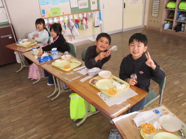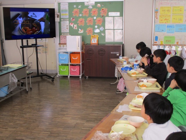 給食の時間には、給食担当の先生が自ら制作した「揚げパンができるまで」の動画が各教室で放映されました。