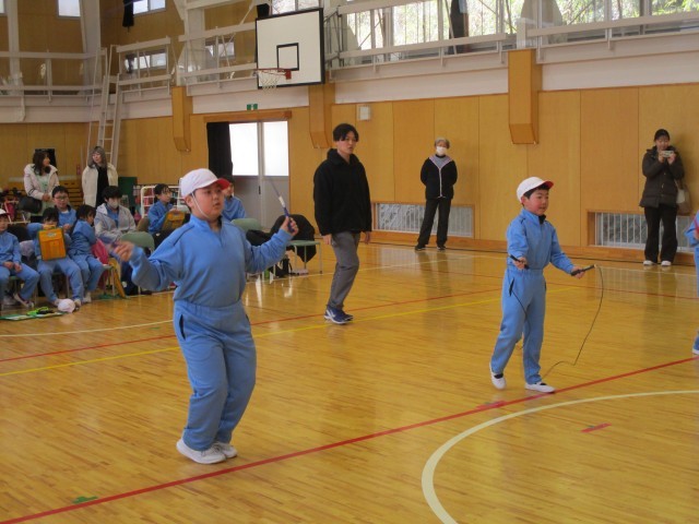 団体種目では、学級ごとに音楽に合わせて跳ぶ「リズム跳び」や、縦割り班で競い合う「長縄跳び」を行いました。
