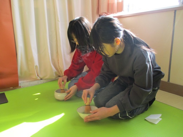 授業の前半では、お茶の歴史や、室町時代に広まった背景について詳しくお話を伺いました。後半は、実際に講師の先生がお茶を点てる様子を間近で見学。初めて見る茶道具の数々や、洗練された所作に、子どもたちは興味津々な様子で見入っていました。