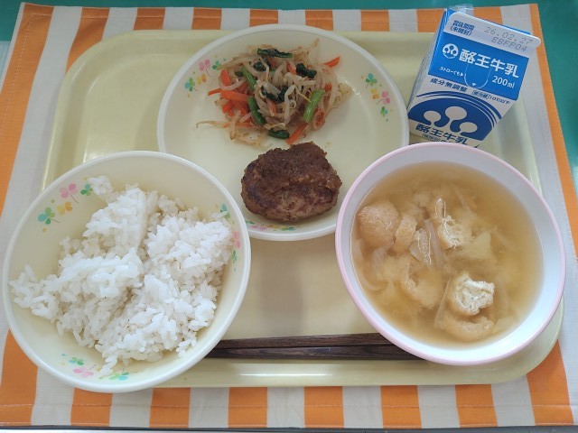 今日の献立は「麦ごはん、牛乳、おろしだれハンバーグ、おかか和え、油揚げとじゃがいものみそ汁」です。麦には、おなかの調子を整える「食物繊維 」がたくさん含まれています。水に溶けない「不溶性食物繊維 」と水に溶ける「水溶性食物繊維 」が半分ずつ含まれていて、腸の動きを活発にしたり、腸内細菌のエサになって環境 を整えたり、バランスよく働 きます。